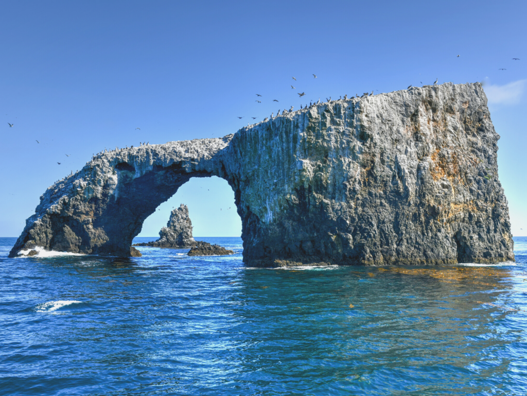 Anacapa Island features volcanic rock, towering sea cliffs, sea caves, and natural bridges created from strong wave erosion, such as the 40-foot-high Arch Rock, a symbol of Anacapa Island and Channel Islands National Park.